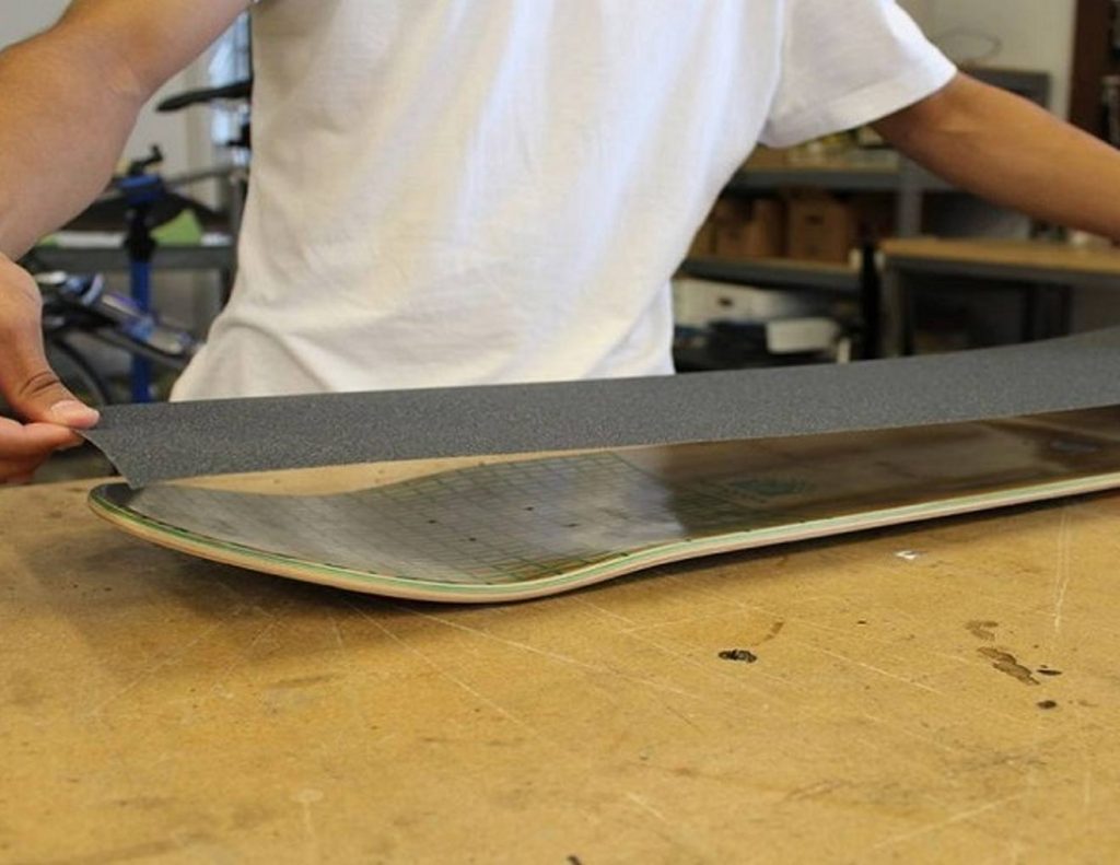 Em geral, ela já vem com a cola e a aplicação deve ser feita com muito cuidado. Com tudo preparado, a lixa deve ser colada do centro para as extremidades (tail e nose). Ao terminar, o excesso deve ser cortado com o uso de estilete.